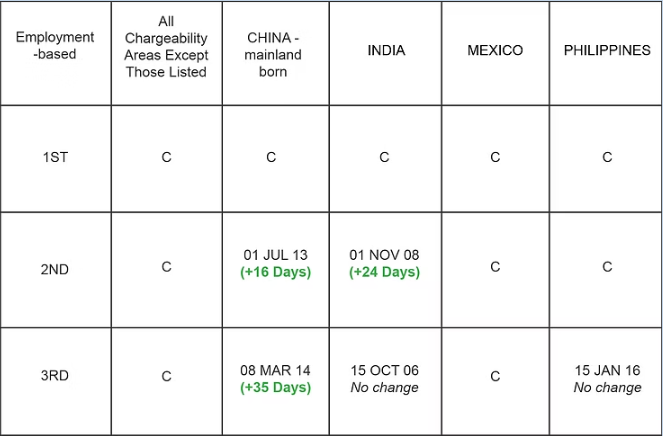 Note that where a preference category is not affected by a quota backlog for a particular country of birth, the cut-off date is indicated as “current” (“C”) in the Visa Bulletin. This means that the foreign national may apply for the final step of the green card process irrespective of his/her priority date.