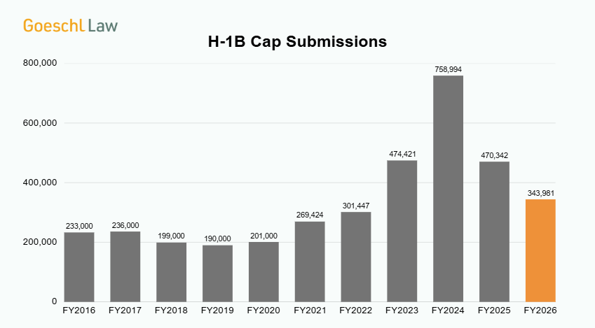 Over the last several years, the USCIS did not announce that the lottery had been reached until well within the fiscal year. For FY2025, for example, the USCIS made the announcement in the first quarter of the year, on December 2, 2025. Also, for most of the last several years, there has been at least one additional lottery drawing, usually in late July or August. This is only the second time since the USCIS implemented the new pre-filing registration process in 2020 that there has been one draw. The likely reason that there were not multiple draws is the much higher number of registrations selected. This year, the USCIS selected 120,141 registrations from a total of 343,981 eligible registrations – an overall selection rate of 34.9%. By comparison, last year the USCIS initially selected 120,603 registrations from a total of 470,342, which reflects a 25.6% overall selection rate.