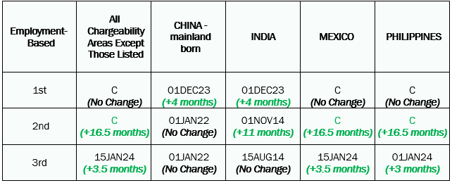 Note that where a preference category is not affected by a quota backlog for a particular country of birth, the cut-off date is indicated as “current” (“C”) in the Visa Bulletin. This means that the foreign national may apply for the final step of the green card process irrespective of his/her priority date.