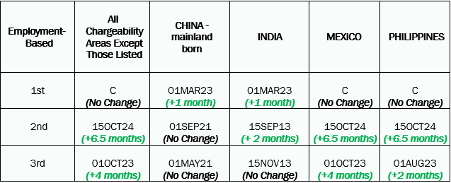 The U.S. Citizenship and Immigration Services (USCIS) has confirmed that the Dates for Filing chart for Employment-Based Visas must be used for the month of March. Individuals who have priority dates that are earlier than the cut-off dates indicated on the Dates for Filing chart may file an adjustment of status application with the USCIS even though their priority date may not yet be current under the Final Action Dates chart. We will reach out to our clients who will be eligible to file next month.