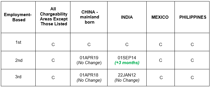 Application Filing Dates (when an immigrant visa or adjustment of status application can be filed). Foreign nationals with priority dates earlier than the dates for filing visa applications indicated in the Visa Bulletin chart below, or where noted as “C” for “current,” may file an immigrant visa application through the Department of State consular service (“consular processing”) during the applicable month. Such persons may also apply for adjustment of status (“I-485 application”) through USCIS in the United States, provided that USCIS has indicated on its website that the cut-off dates indicated on the Application Filing Date chart may be used for adjustment filings during the applicable month. If USCIS does not indicate that the Application Filing Date chart may be used for adjustment filings, the adjustment application must be filed based on the Final Action Date chart (see below).